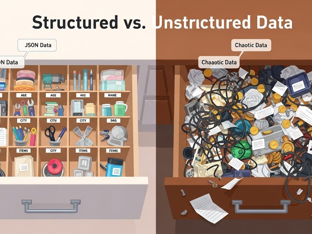 n8n을 비롯한 대부분의 최신 웹 서비스들은 서로 대화할 때 JSON(JavaScript Object Notation)이라는 언어를 사용합니다. 개발자가 아니더라도 이 구조를 이해하는 것은 필수적입니다. 어렵게 생각할 필요 없이, JSON을 ‘이름표가 붙은 정리 상자’라고 생각하면 됩니다.